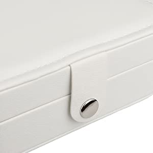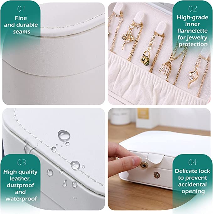 【Premium Quality】 — The jewelry organizer box is made of PU leather, durable, odorless and moisture proof. The bead fleece interior can protect your jewelry against scratches and damages. The snap button design will not open easily when placed in a bag or suitcase