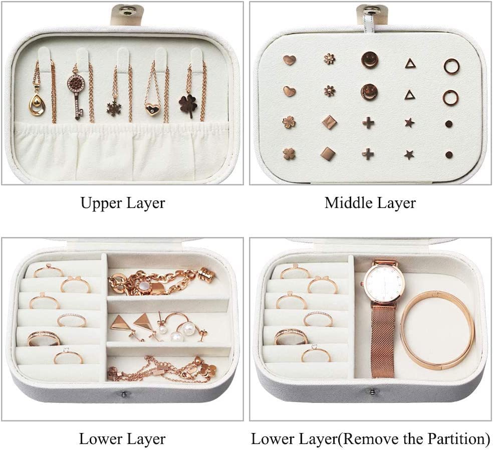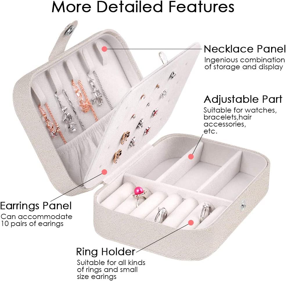 【Multi-functional Jewelry Organizer】 — Multi-functional travel jewelry storage box with double-layered partition design provides stud plates, 5 necklace hooks, an elastic pocket, ring grooves and adjustable storage space to keep your jewelry separated and prevent them from shaking and tangling, and the button design is convenient to open and close