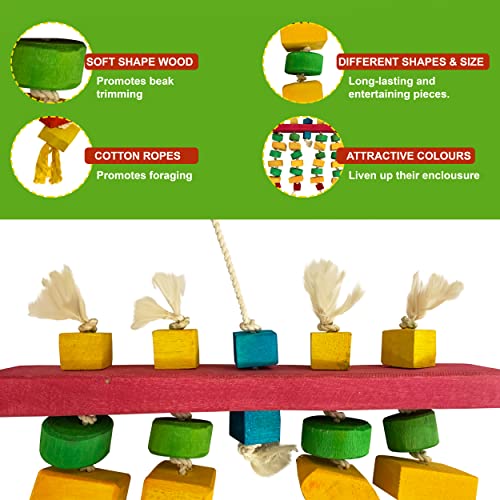♥ BEAK TRIMMED: Parrot’s beak keeps growing to keep sharp. if her beak is long can affect the ability of the parrot to eat and damage her health. Our parrot cage toys contain colored wooden blocks in various shapes to attract your parrot to chew, help your feather friends to preen, and condition their beak.
