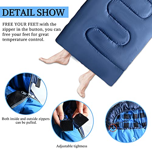DETAIL PART—USER-FRIENDLY: Double-sided zipper with anti-snag makes it easy to open and close lightweight sleeping bag from inside or outside. If you feel the sleeping bag is too warm, our sleeping bags can unzip the bottom to make your feet come out through the wind, keep you cool.