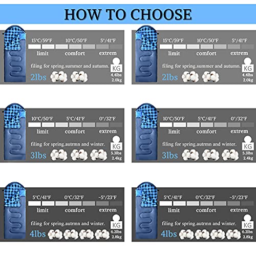 2/3/4lb DIFFERENT WEIGHTS FILLERS FOR CHOICE—-MEET YOUR NEEDS: 2lbs filling flannel sleeping bag fits temperature range 41-59℉(5-15℃). 3lbs filling flannel sleeping bag fits temperature range 32-50℉(0-10℃). 4lbs filling flannel sleeping bag fits temperature range 23-41℉(-5-5℃). People who are afraid of cold can choose the thicker sleeping bag.