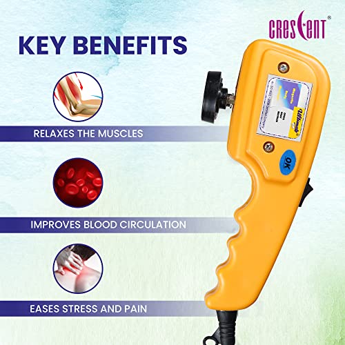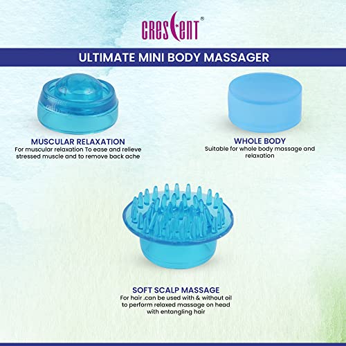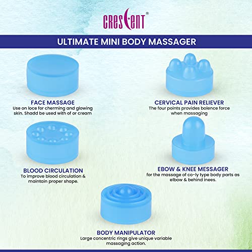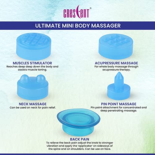 Crescent Ultimate Mini 14-IN-1 Quick Relief Full Body Electric Massager comes with 14 applicator for Headache, Feet Pain, Back Pain, Sinusitis and Scalp Massage and 2 adjustable speed setting so that one can adjust the vibration as per one’s requirement | Headache: Roll gently the cup applicator on top of Spine, Neck and Temples to get rid of headache| Feet Pain: Apply the cup applicator to the ball and heel of the foot to relieve the nagging pain| Back Pain: to relieve the back pain adjust the knob to stronger Vibration and apply the cup applicator on sideways of the spine and on shoulders, also can be used on face| Sinusitis: Massage gently around nose, sinuses and chest to ease soreness and aches| Scalp Massage: Use spiked rubber to massage the scalp to relieve nervous tension, clear dandruff during and after the course of your scalp massage