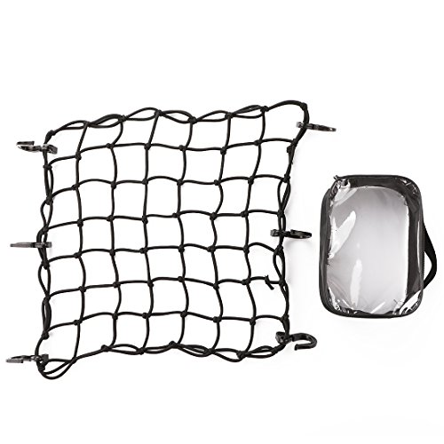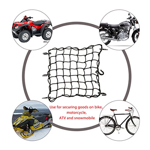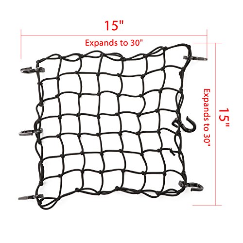 CZC AUTO 15″x15″ Black Latex Bungee Cargo Net Strech to 30″x30″, Gear Helmet Luggage Netting with 2″X2″ Small Mesh and 6 Adjustable Plastic Hooks, for Motorcycle Bike Paddleboard Quad Canoe Moped ATV