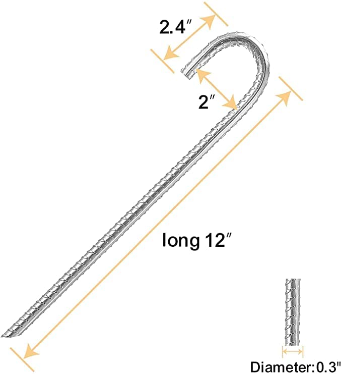 PRODUCT SIZE: Each rebar stake measures 12 inch long.The hook length is 2.4 inch and the opening width is 2 inch.