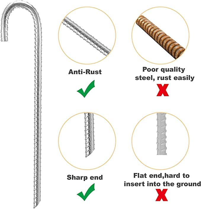 HEAVY-DUTY GROUND ANCHORS: The moderate length of stakes allows the stakes to go deep underground and the thread on their surface can increase the friction with the soil. J-hook design can help to reinforce the sturdiness of the installation.