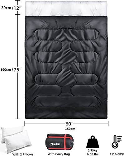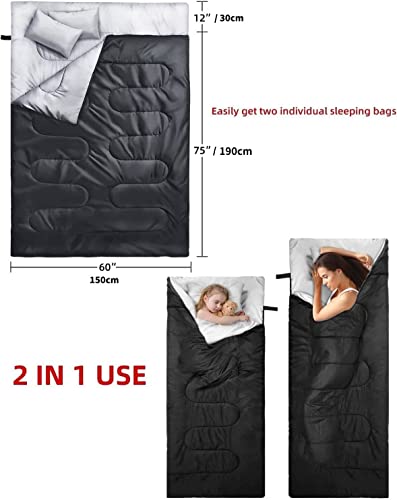 Double Sleeping Bag with 2 Pillows, Ohuhu Waterproof Lightweight 2 Person Adults Sleeping Bag Can Become Two Individual Sleeping Bags for Camping Backpacking Hiking with Carrying Bag