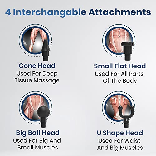 Comes with 4 interchangeable massage heads to ensure that no muscle group goes untreated. The Round Head is best for big muscle groups like the shoulders, back, and legs. The Bullet Head helps to relieve tissue soreness. The Fork Head is best for the Spine, Neck, and Shoulders.