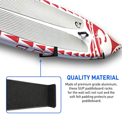 Create wall art by using our SUP wall racks to display your favorite SUP in any room of your house or garage! The simplistic design of these racks allows the focus to be on your SUP creating a great display. Made of quality aluminum, these SUP racks will not rust and the soft felt padding will protect your surfboard. They are easy to mount and are a great alternative to surfboard rack Ceiling options or bulky surfboard racks for the wall vertical storage. Whether you choose to display your surfboard in your house or use these surfboard racks for garage, our sturdy surfboard wall racks can be used as a longboard rack or to hold any size surfboard.