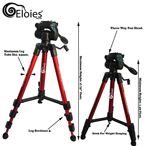 Lightweight Solid & Sturdy – Built with premium aluminum tube (max. dia. 23mm) & precision-injected plastic pan head & flip-lock knobs, Eloies video phone camera tripod is built to last in rugged use. Tripod weight 1.1Kg, max. load 2.3-5 Kg.