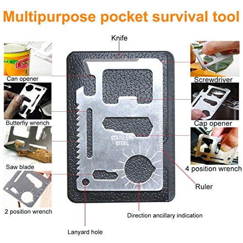 ☞ Stainless Steel Versatile Tool Card: A multi-tool by itself. It has can opener, knife edge, screwdriver, ruler, cap opener, 4 position wrench, butterfly wrench, saw blade, direction ancillary indication, 2 position wrench, and a key ring holder. All of that are made from steel.