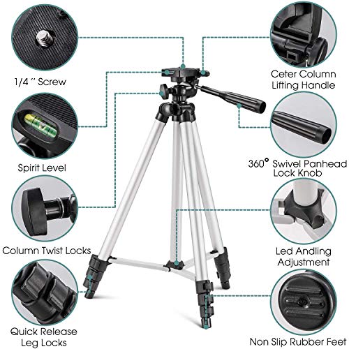 Included Components : Smartphone Mount Adapter X 1, Quick release leg lock, Carrying Bag X 1, Compatible with all cameras and camcorders, 50inch Camera/Smartphone Tripod X 1, Grip for adjustering head position, 1 Camera Mobile Phone Stand Holder comes with carrying bag, Non-slip rubber feet, Lightweight and portable