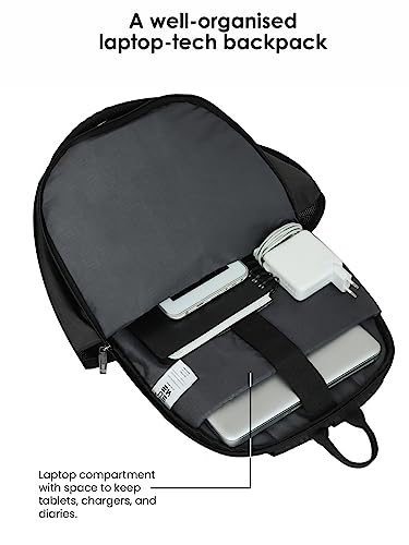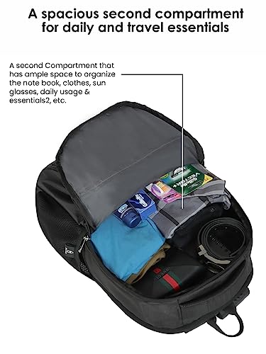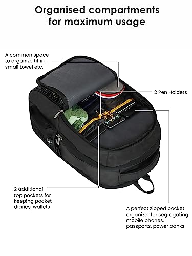 Large Compatment dedicated tech-safe that can store laptops up to 15.6 inch, Second Large Compartment for Books, Cloth & Sunglasses & Essentials etc. and Third compartment 2 Small pocket for Chargers and Earphones or Wallets , 2 Pen Holders & zipper compartment for Mobile Phone, Passport etc.