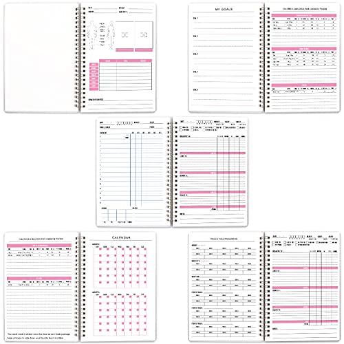 1 measure page, 1 goals page, 2 calories for foods pages,1 calendar page, 1 progress page, 61 food pages, 61 workout pages, this food journal fitness journal has all you need to track your food and has diagrams of different exercises that you can do to target different parts of your body.