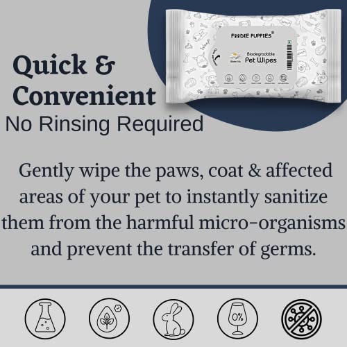 Foodie Puppies Biodegradable Pet Wet Wipes with Fresh Fragrance For Dogs and Cats offer a superb way to get rid of dirt and odor from your pets body. The goodness of Aloe-Vera and vitamin E promotes the health and wellness of skin and shiny coat. Foodie Puppies has been approved by veterinarians and can be safely used over dogs, cats, and their offspring. The wipes multitask as a cleanser, deodorizer, and conditioner. It won’t remove spot flea treatments the pet may be undergoing. Without the use of alcohol or toxics, saving the pet and environment from harmful chemicals. Pet Wipes For Dogs and Cats present to your convenience and swiftness in sanitizing your pet. Be it the dirty paws of the pet as it enters the home after a stroll outside, or complete head to toe cleansing, the vet approved wipes would effectively serve any purpose. It is a safe and hygiene enhancing pet grooming product every pet parent should have.