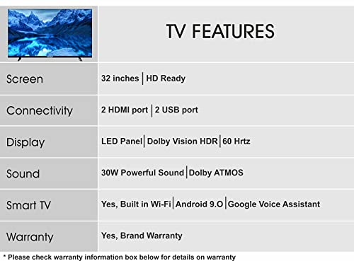 Smart TV Features: Built|in Wi|Fi | Netflix | Google Play Store | YouTube | Built|in Miracast | Media center | with Google Voice Assistant | Android 9.O Based OS