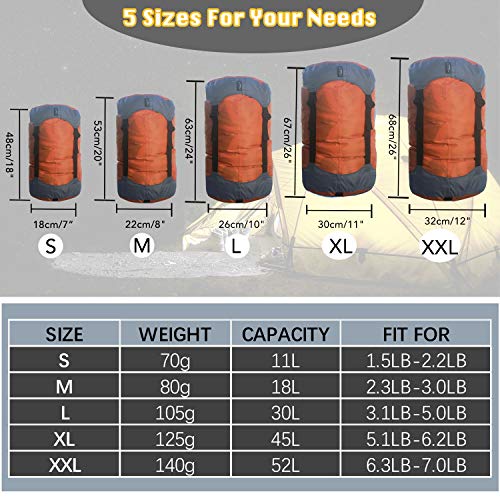 Keep Your Gear Organized: Available in 5 Sizes (11L/ 18L/ 30L/ 45L/52L) for all your needs, ideal for internal pack organization, packing up whatever you feel like belongs in a bag that can be compressed, eg clothes, blankets, sleeping bags, pillows, hats, gloves.