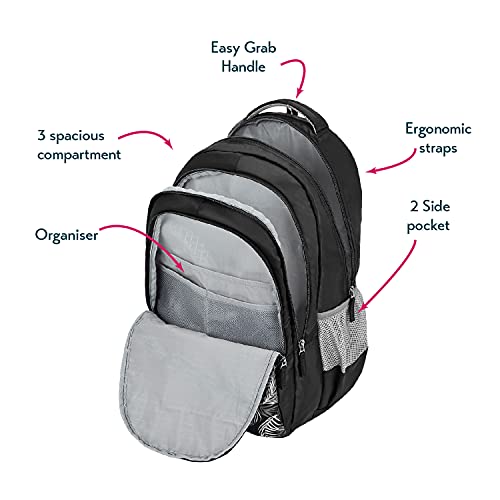 NUMBER OF COMPARTMENTS : 3 Spacious compartment to keep your essentials like textbooks, stationary, lunchbox etc. TWO SIDE POCKET : The backpack provides 2 exterior side pocket for holding water bottle,clipping pens or pencil or storing other items.
