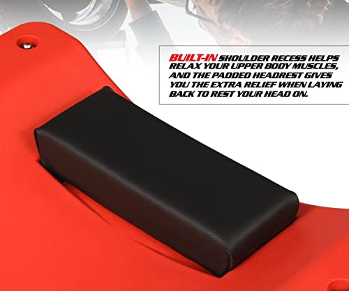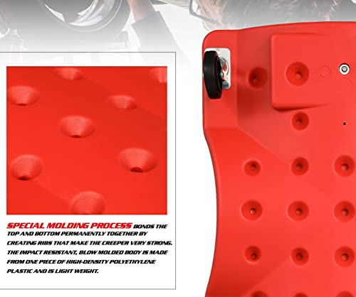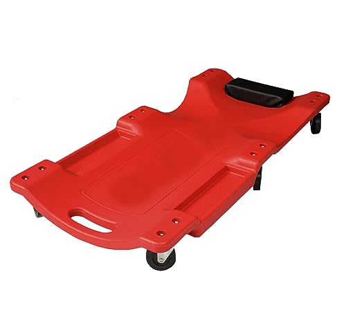 Ergonomic designed with a built-in shoulder reces, This advanced design give you more support from the frame when you sit slowly on the end of the creeper, and lay back to rest your head on the padded headrest to give you the extra relief. 40″ Long X 19″ Wide X 6″ H Overall Size; 6 X 3″ Diameter Non Marring Polyurethane Swivel Caster Wheels; Low Profile 4.25″ Height for Increased Clearance Under Vehicle. 300 Lbs Max Load Capacity with Padded Headrest, fits for most users. Socket Tool Included for Easy Assembly; Side Pockets for Holding Tools & Bolts. High-Density Polyethylene Construction Frame, lightweight design, only weighs 9lbs, however it is extremely strong. With its impact resistant, it gives most users extra comfort while laying on it. Portable design carrying handle at the bottom which makes this rolling cart easy to pick up, position, and transport, allows you to work in your garage or workshop with ease.
