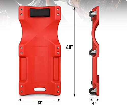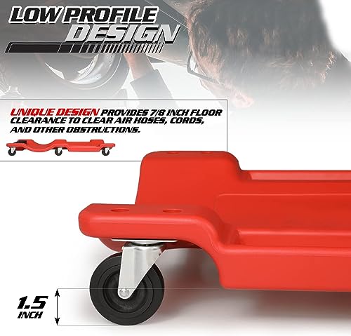40″ Long X 19″ Wide X 6″ H Overall Size; 6 X 3″ Diameter Non Marring Polyurethane Swivel Caster Wheels; Low Profile 4.25″ Height for Increased Clearance Under Vehicle