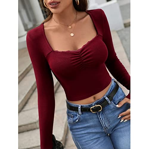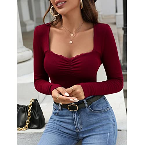 GLARE & BLAIR Sweetheart Neck Lace Trim Women Long Sleeve Casual Western Stylish Ribbed Tops