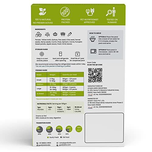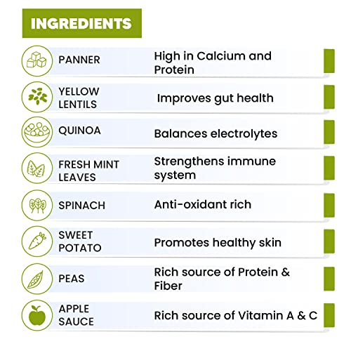 Ingredients : Paneer, Yellow Lentils, Pumpkin, Peas, Flaxseed, Chia seeds, Quinoa, Sweet potato, Spinach, Carrots, Applesauce, Mint fresh leaves, Fennel seeds