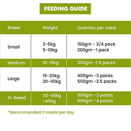 Feeding Guide: Suitable for all dogs and ages > 3 months Small Dogs & Puppies: (200-400g) Daily Serving, Medium Dogs: (400-600g) Daily Serving Large Dogs: (600-1000g) Daily Serving, X large Dogs: (1000-1400) Daily Serving