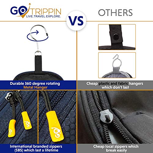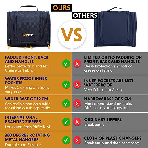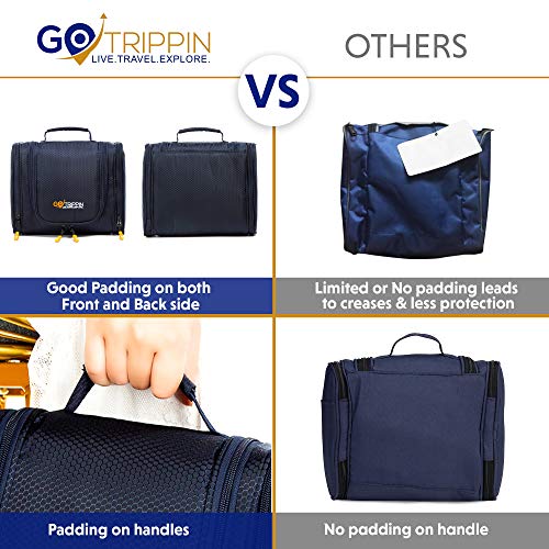 Excellent all round padding; Gotrippin large travel kit for toiletries has strong padding on front and back to keep all your essentials, cosmetics and grooming kits safe; Rotating metal hook hanger: Gotrippin compact utility bag have 360 degree rotating metal hanger for easy hanging in the bathroom or shower
