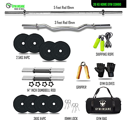 20 kg excersice equipment for home gym : 50 kg exercise equipment with good Quality PVC Material.gym weight plates strength training & weight lifting gym equipment for home gym workout 5 FEET STARIGHT ROD: 5 FEET Straight rod comes with two locks. 3 feet curl rod:Anti slip grip 3 feet barbell perfect for weight lifting strength training with lock . 14 inch dumbbell Anti Slip ,Comfortable grip dumbbell set -comes with plastic nuts filled with concrete with deep threaded prevent slipping while workout Make in India. :This gym kit perfect for gym workout. Highly durable and long lasting Ideal for unisex. home gym equipment for men ,gym equipment for home work out