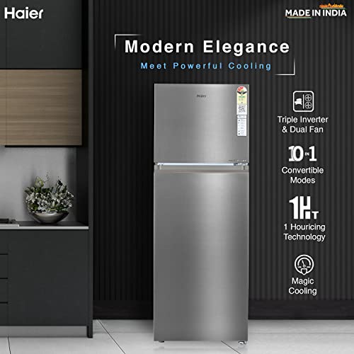 Haier 358L 3 Star Frost Free Inverter Double Door Top Mount Refrigerator (2023 Model, HEF-363TS-P, Inox Steel, Convertible)
