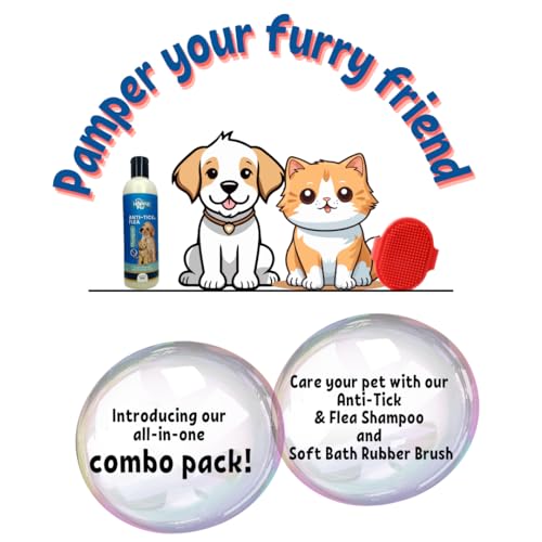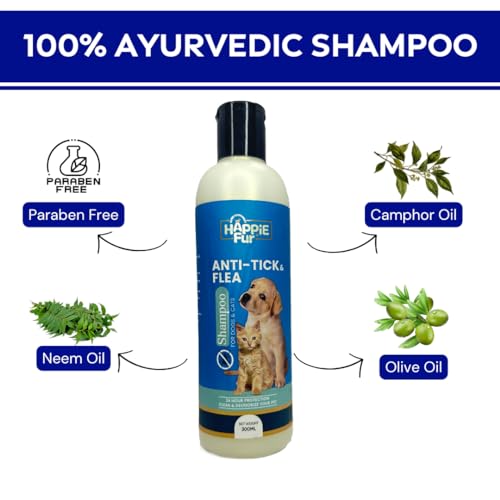 Happie Fur Natural Neem Anti Tick and Flea Dog Shampoo and a Shampoo Scrubber | Pet Shower & Bath Supplies for Cats & Dogs | Long & Short Hair Dog Scrubber for Bath | 300 ml