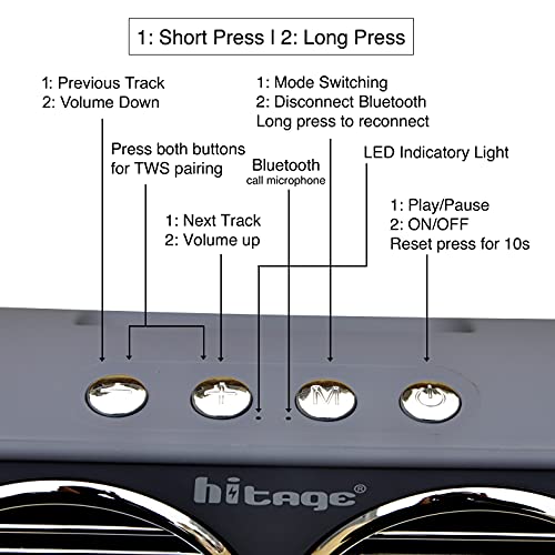 HITAGE BRAND BLUETOOTH SPEAKER BS-315 Enjoy signature loud 5X5Watt sound without any distortion, sound engineered using Listen Technologies USA devices.Bluetooth speaker is the ultimate premium ABS build – for portability and ease of use. Due to the light and sleek design carry your speaker on the sweat Proof . Quick connect your devices with this portable speaker without any lag with Bluetooth 5.0 technology. 5-6 hours long more battery life with type C input, now listen to your music without worrying about power with the. Multiple inputs of Bluetooth, AUX & Micro SD to keep you connected YOUR way. Comes with a 1-Month warranty to Manufacturing Defects specialists.