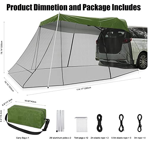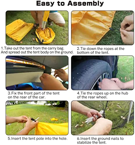 Multiple uses: The car canopy can be used for vehicles, SUVs, MPVs, trucks, hatchbacks and cars, and can also be used as a canopy. The awning has a larger space and stable structure, suitable for boating, camping, driving trips, sporting events and festivals. 1 Set * Car Rear Tent Umbrella Extension (Included: 2 * 2m Aluminum Alloy Grab Bars 4 * 3m Windproof Ropes 2 * 2m Elastic Ropes 12 * Aluminum Alloy Ground Ropes nails. 1 * storage bag, 1 * pole bag, 1 * accessory bag)