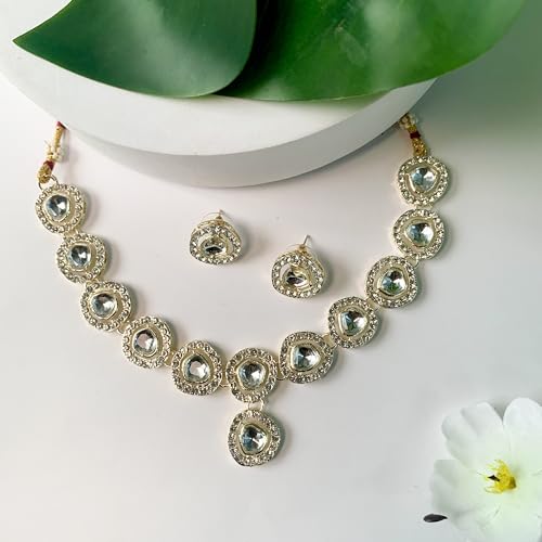 Elevate your traditional look with the included maang tikka. The delicate design, combined with the radiant Kundan and pearl elements, adds a touch of royalty to your hairstyle, making you the center of attention at any event. The choker necklace features a statement design that gracefully encircles the neck, creating a striking focal point. The gold-plated finish adds a touch of luxury, making it the perfect accessory for weddings, festivals, or any special celebration.