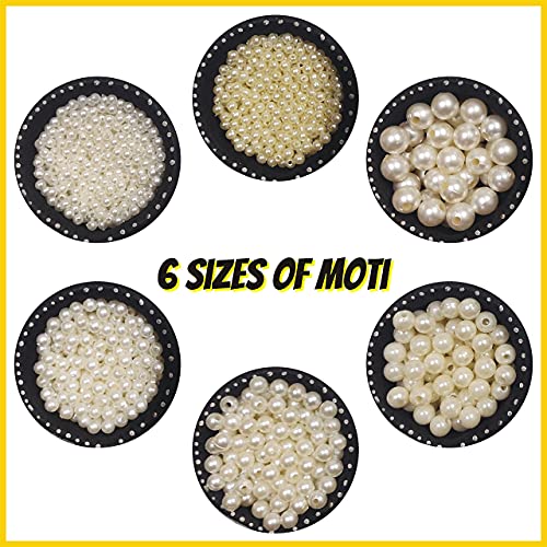 The Seed Bead Material Kit for Jewelry Making includes approx 500 – 540 beads of 15 color 8/0 3mm Seed Beads (15 gm each) , 6 Sizes of Moti Pearl (15 gm each, approx total 50-100 each) , Earring Hooks and Needle , Sewing Scissor , Tweezers , Nylon Wire