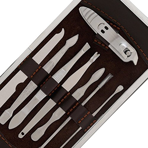 12 Pieces Manicure Pedicure Set Includes 3 Nail Clipper/Trimmers, 1 Scissor, 1 Blackhead Needle, 1 Cuticle Trimmer, 1 Ear Pick, 1 Eyebrow Tweezer, 1 Nail file, 1 Peeling Knife, 1 Singled-edged Double Side Stick, 1 V-shaped Push Stick.