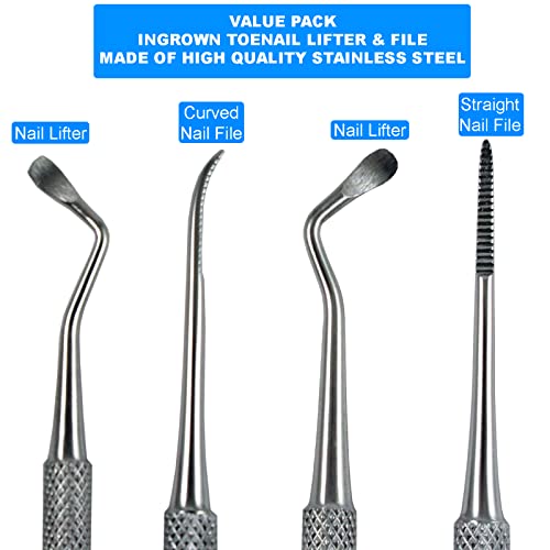 Ingrown Toenail Kit, Double Ended Toe Nail Lifter Dual Sided Nail File Fingernail Cleaner Trimmer Stainless Steel Spa Salon Quality Manicure Pedicure Grooming Nail Care Tools 3 Pc Set by Krisp Beauty