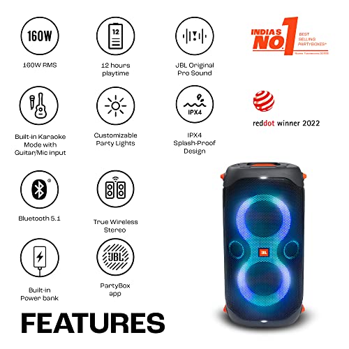 JBL Partybox 110 | Wireless Bluetooth Party Speaker | 160W Monstrous Pro Sound | Dynamic Light Show | Upto 12Hrs Playtime | Built-in Powerbank | Guitar & Mic Support PartyBox App (Black)