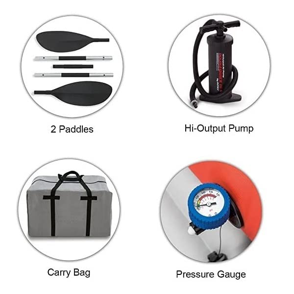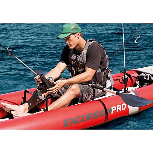 Having the right kayak to support you on your day in the water can make a huge difference in the quality of your experience. That’s why the Excursion Pro Kayak is made with features like adjustable seats or built-in footrests to keep you comfortable. Not only that, it’s also made with fishing rod holders on each side for hands-free fishing. There’s also a waterproof bag you can latch into the front for anything you need to carry out onto the water with you. Since it’s inflatable, it’s easy to stow away on a car or in the back of a truck. Even when it is inflated, handles on the front and back give you an easy way to carry it over land or onto a beach. Packaged with a pair of aluminum oars and an air pump, the Excursion Pro Kayak has everything you need to start enjoying your day on the lake, river, or ocean. Super-Tough laminate material with polyester core for high strength and durability, ensuring high impact and abrasion resistance, while retaining light weight and portability High pressure inflation provides extra rigidity and stability, with high pressure spring loaded valves for easy inflation and fast deflation Two Specially designed removable skegs for optimal maneuverability through deep and shallow waters Two floor mounted footrests Two integrated recessed fishing rod holders Removable and adjustable mounting bracket for additional accessories, such as GPS systems, fish finders, swivel fishing rod holders, etc. Grab handles on both ends Two adjustable bucket seats Inflatable booster pad for elevated seating Storage space in bow and stern with stainless steel D-rings for tying down dry bags and gear Includes a carry bag and repair patch 3-ply super tough construction employs a high molecular PVC that is unaffected by gasoline, oil and salt water. It is highly resistant to damage from abrasion, impact and sunlight. It also permits more air pressure for rigidity. Includes 86in Aluminum Oars and High-output pump Weight:46.73 LBS