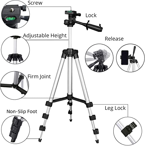 JNKC This product is equipped with remote and microphone to make it a complete package for making videos for youtube and other videos of still photos. With a compact size of only 13” when retracted the tripod makes the perfect companion for every special moment. You can carry it with ease to any event. Easily fits in any travel bag. Light aluminium construction makes it conveniently weighted. Easy Setup Easy use clasps make extending and retracting the tripod legs a breeze. Simply open clasp to unlocked position and extend the section you wish to make longer. The legs can be extended individually or together for the best result in stability and camera angle Fast Neck Extension Extending the neck in the Tripod is as easy as twisting the locking knob counter clock wise and pulling up on the neck until desired length is achieved. To lock simply tighten the knob by twisting clock wise Smartphone Mount With the Universal Smartphone Mount it is a breeze to set up any type of smartphone from 2.2″ to 3.4″ in width. The Rubber Pull tab allows for quick and precise mounting / dismounting of your devices. It also has Padded grip to avoid cellphone damage .Professional Tripod with 3-Way Pan head for Digital Cameras and Camcorders DV Get rid of the shakes with this trusty 435-inch Aluminum Tripod. This tripod features aluminum construction with black plastic fittings, making it lightweight for portability, and the brace and non-slip feet keep it standing securely in place. It makes everything much easy and it also means that you can fix the phone with a stand or tripod instead of holding it all the way. Pair your device with Bluetooth Remote Shutter and enjoy the big picture taking. The key to great auto portraits is in the palm of your hand remote Bluetooth shutter.