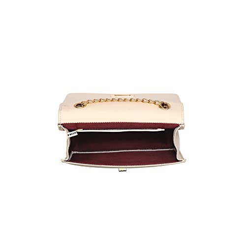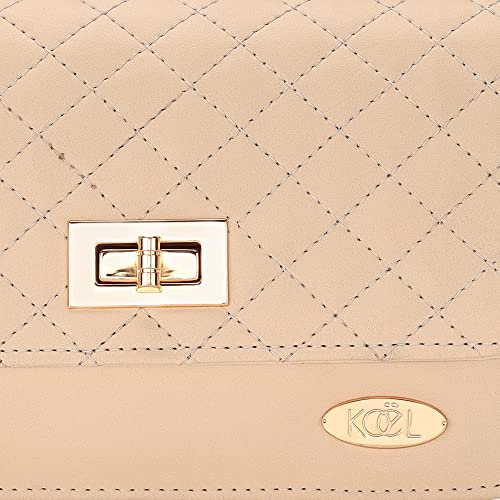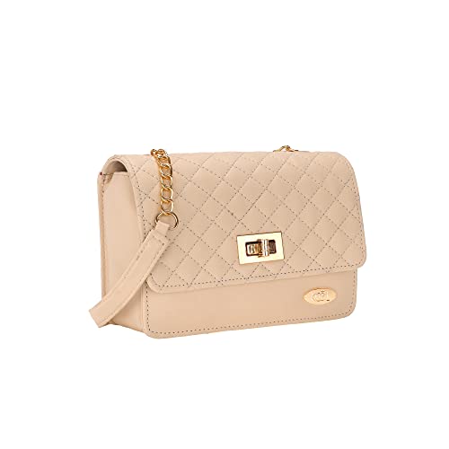 Stylish sling bag with quilted flap with a gold colored Turn ‘n’ Pull twist lock, Its belt is a combo of metal chain and PU. This is one of the most stylish and popular designs in sling bags, suitable for both young girls and women. Stylish sling perfect for parties, cocktails and clubbing, and for casual daily use.