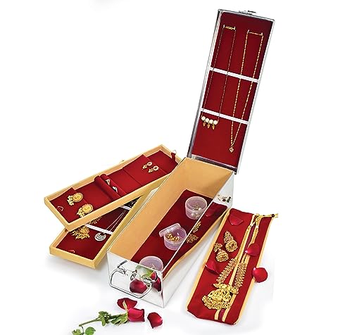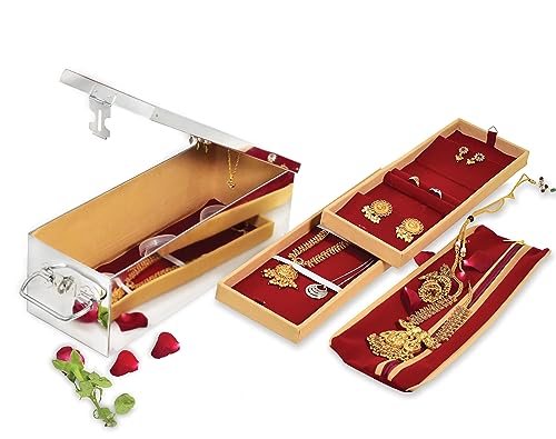 Komal Stainless Steel Large Traditional Jewellery Box for Locker Comes with 2 Velvet Trays,3 Fixed Plastic Boxes for Small Ornaments & Bangles,1 Velvet Pouch for Organizing & Safeguarding Jewellery
