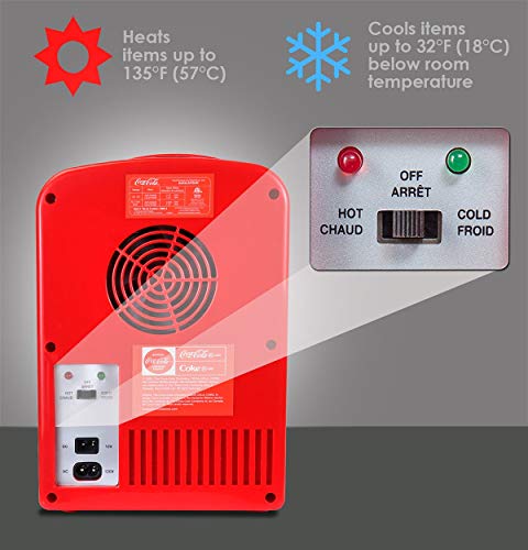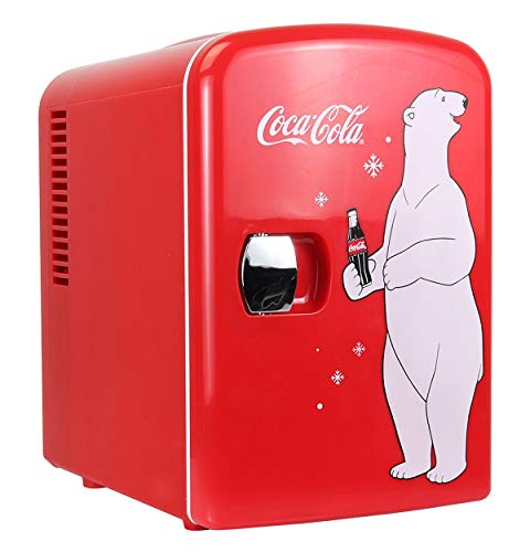 Keep up to six 12-ounce cans of soda or other favorite beverage cold and easily accessible with this mini fridge–great for getting through finals week or for staying hydrated when watching the big game. The compact unit takes up minimal counter space, and it makes a fun addition to any dorm room, workshop, game room, or bar area with its vibrant red exterior and white “Coca-Cola” trademark. The appliance cools up to 32 degrees below ambient temperature, and its self-locking recessed door handle closes securely. The 4-liter-capacity mini fridge measures 11 by 8 by 11 inches.