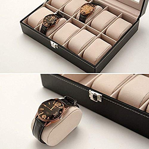 KRISHYAM® Watch Box Organizer Pillow Case 10 Slot Display Cases with Framed Glass Lid Elegant Contrast Stitching Sturdy and Secure Lock for Men and Women Watch and Jewelry Large Holder Boxes