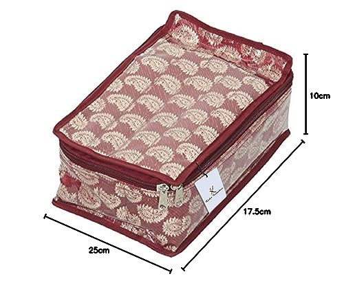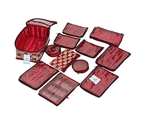 Kuber Industries Brocade Jewellery kit with 12 Pouch|Solid Print With Waterproof Outer Material|12 Pouches & Zipper Closure|Size 25 x 17 x 10, Pack of 1 (Maroon)