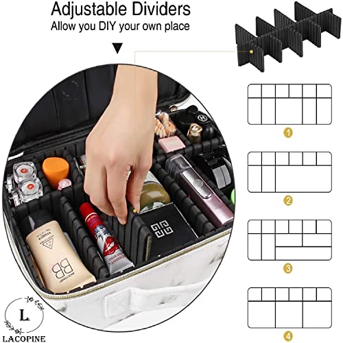 ADJUSTABLE PARTITION COMPARTMENT: The extra large compartment has two sets of detachable partitions of different sizes. You can freely adjust and design the internal storage space, easily and effectively classify your cosmetics and tools, and keep everything in order.