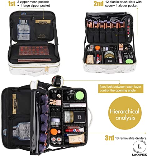 SMART DESIGN: This travel makeup bag has several compartments, makeup brushes slots, and zipper pocket, you can keep all necessities tidy and orderly. You can rearrange adjustable compartments to fit your needs.