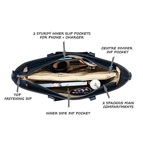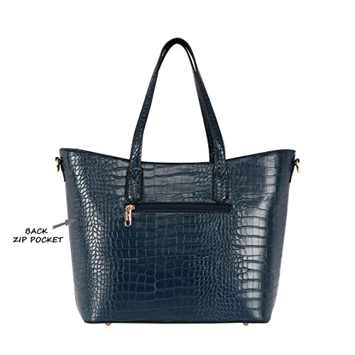 Large sized tote bag with croco texture & high shine metal logo on the front.