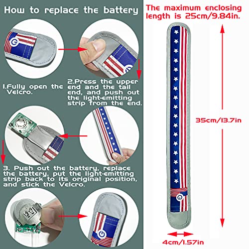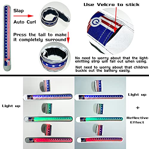 【Refelective Gear】The edge of the bracelet is grey reflective cloth. Reflective cloth reflect even when the light is off, but notice that reflective cloth itself does not shine. Slap and it will wrap around and holds that shape, you can wrap it around your wrist, arm or a bag strap, even your ankle. It is light weight and Comfortable.