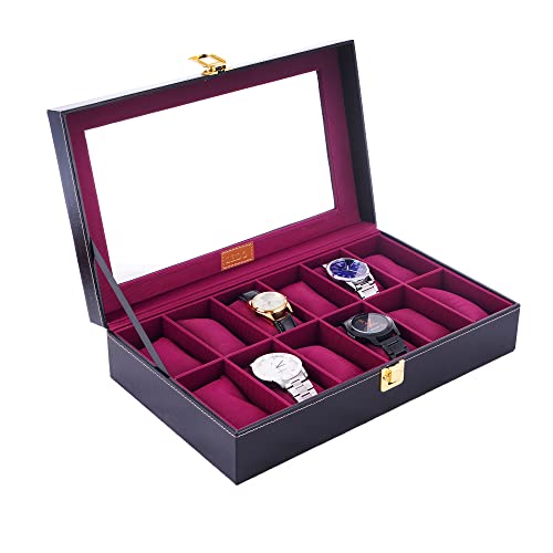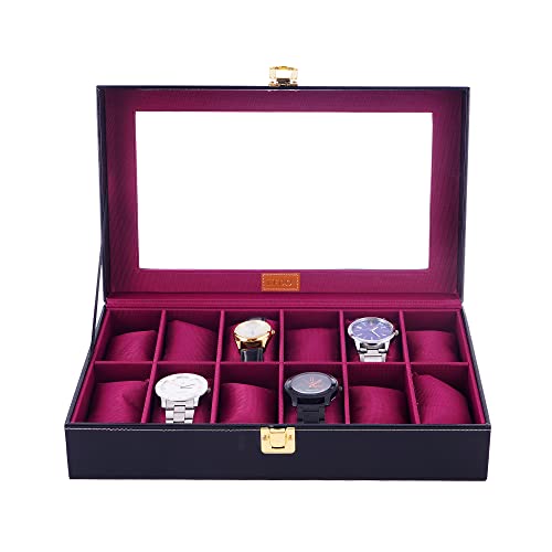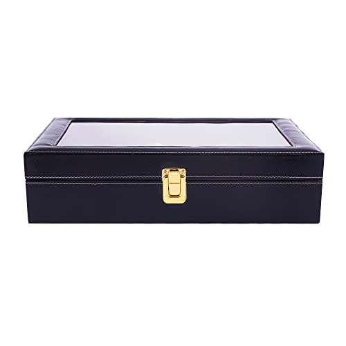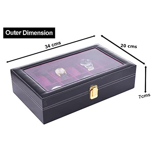 LEDO Watch Box Holder with Transparent Display in 12 Slots of Watches in PU Leather with Black Color