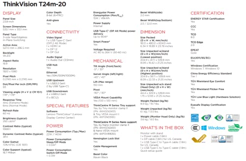 A monitor that’s more than just another screen, ThinkVision T24m-20 renders easy connectivity and manageability to businesses. Enjoy the generous screen space of 23.8 inches on this FHD In-Plane Switching panel. With 3-side NearEdgeless bezels and daisy-chaining capability via the DP-out port, enjoy an unrestricted view and multitasking in a multi-monitor setup. It is equipped with USB Type-C technology that provides rapid transfer speeds via a one-cable solution. For secure and reliable connectivity and remote management, an Ethernet port let’s user work uninterrupted. Ergonomic features with a clutter-free, space-saving design can’t go unnoticed on the T24m, which makes for a comfortable work experience wherever the users are. The monitor also actively works to safeguard your eyes with TÜV Rheinland Eye Comfort, TÜV Low Blue Light (Hardware Solution) and Natural Low Blue Light technology with Eyesafe certification that reduce flicker and harmful high-energy blue light that could otherwise cause eye fatigue. With sustainable packaging using pulp cushion, the T24m monitor remains environmentally friendly throughout its life-cycle. With ThinkColour software, you can instantly and effortlessly adjust fine controls of the monitor.